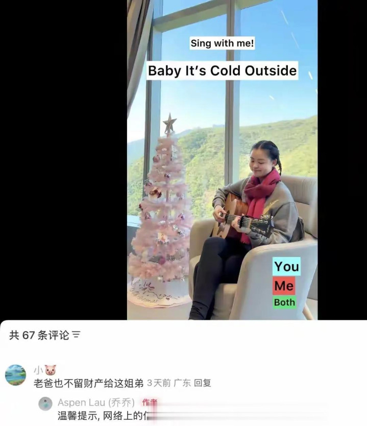 12月19日,刘銮雄和吕丽君的女儿刘秀盈,秀出了在自家豪宅装饰圣诞树的画面,同时,还分享了庆祝圣诞的吉他弹唱。