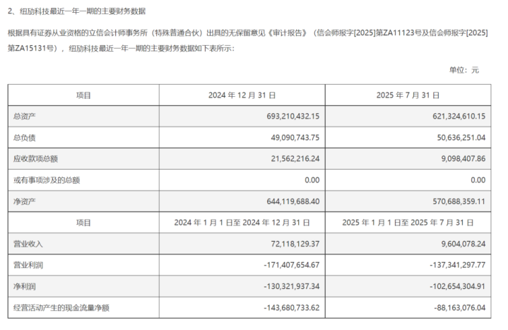 岩山科技在公告中披露了纽劢科技的财务数据。2024年度,公司实现营收7211.8万元,净亏损为1.3亿元;2025年前7个月,公司实现营收960.4万元,净亏损为1.0亿元。